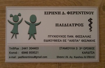 customer tabsΕπικοινωνίαΠαρακολούθηση του νεογνού από το μαιευτήριοΣυμβουλές στους γονείς για τη φροντίδα του νεογνού κι υποστήριξη του μητρικού θηλασμούΔιατροφήΣυμβουλευτική γονέωνΕμβολιασμός σύμφωνα με το εθνικό πρόγραμμα εμβολιασμούΠαρακολούθηση σωματικής και ψυχοκινητικής ανάπτυξηςΤακτική παρακολούθηση βρεφών – παιδιών - εφήβωνΕπείγοντα περιστατικάΧρόνιες νόσοι κι αναπτυξιακά προβλήματαΆρτια εξοπλισμένο παιδιατρείο με ευχάριστο περιβάλλονΔυνατότητα 24ωρης επικοινωνίας με την ιατρόΚατ' Οίκον ΕπισκέψειςΣύμβαση με ΥΕΘΑΠαιδίατροιΥγείαΣταμούλη 3, 3ος όροφος, ΚαρδίτσαΚΑΡΔΙΤΣΑΘΕΣΣΑΛΙΑ 2441304403 6946959521pedferentinou@gmail.comΠαιδίατρος Φερεντίνου Ειρήνη Το προτείνω (έχει προταθεί 1 φορές) ΦωτογραφίεςFacebook LikeShare on FacebookTweet Widget